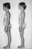 Secondly, we can look for reciprocity between the two abdominal diaphragms—the respiratory diaphragm and pelvic diaphragm (pelvic floor). In a relaxed and balanced acture, the two diaphragms face each other, like the top and bottom of a beach ball, or the two hands in someone practicing tai chi (see Figure 4). Commonly, in a swayback (lordotic) acture, the two diaphragms will both aim forward. In the less common flat back (flexed) pattern, the two diaphragms can aim backward, again missing each other. Sometimes the rib cage can be shifted forward or (more commonly for us Westerners) backward relative to the pelvis, and these two diaphragms again lose their reciprocity.