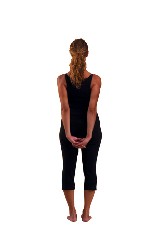 Chest Expansion: Place your feet hip-width apart. Interlock your hands behind your back. Squeeze your shoulder blades back. Hinge your body at your hips, drawing your belly button in and fold over forward. Note: If you need to, bend your knees.
