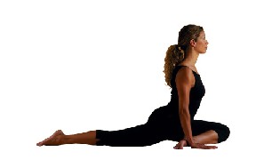 Pigeon: From the low lunge, walk your foot over to the opposite hand and drop your knee to the floor. Your extended leg should be back with your knee and toes pointed to the floor. Note: Lift your chest if you feel tension in your knee. Support your body with your hands, if necessary. You may need to put a blanket or soft support under your extended leg and hip.