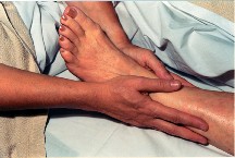 4. Work down to a general press of the hip and upper thigh. Encompass the knee, then encompass and general press the lower leg.