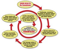 From the massage therapist’s office to the traditional medical facility, clients/patients are presenting in increasing numbers with a variety of unexplained symptoms. However, there are definitely some shared symptom commonalities such as predictable tender points, extreme fatigue, poor sleeping patterns, and whole-body pain upon awakening. Regrettably, musculoskeletal pain research generally lags behind well-funded scientific projects with possibilities for more lucrative outcomes. It often takes years to definitively confirm and classify conditions with vague, widespread symptoms like fibromyalgia. This confusing disorder continues to be poorly understood, and clients often suffer for several years before a medical diagnosis is made. Figure 2 illustrates an interesting biological explanation detailing the downward degenerative spiral seen in many fibromyalgia clients.