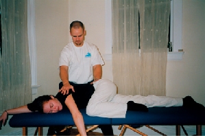 The pandicular movement process involves the client’s active participation. To begin, the Hanna Somatic Educator assists the client in comfortable body positioning to be able to access the desired muscles or muscular systems most efficiently. The client is asked to contract the muscle while the Hanna Somatic Educator provides kinesthetic and proprioceptive feedback through the entire range of motion (see Photo 7).
