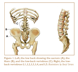 Most people aren’t clear about where their low back begins and ends. In an average-sized adult, the low back is about six inches long. It is bordered by the bottom of the rib cage, the top of the hip bones, and the superior portion of the sacrum. Functionally speaking, the low back consists of two segments that work together: the five lumbar vertebrae (L1, L2, L3, L4, and L5) and the sacrum (Figure 1).