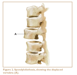 In some cases, instability is caused by loose ligaments. The function of ligaments is to hold our bones together in order to keep our joints stable. Ligaments, unlike muscles, need to be tight to do their job effectively. When ligaments are loose (i.e., longer than they should be), our bones and joints become unstable. Some people are born with ligaments that are loose. Ligaments can also become stretched as a result of injury. The spinal ligaments are supposed to hold the vertebrae together tightly. Abnormal lengthening of these ligaments can be a contributing factor in back pain. One structural problem associated with such lengthening is called spondylolisthesis — (pronounced spon-di-low-lis-thee-sis). This is a congenital condition in which one or more of the vertebrae are substantially misaligned (Figure 2).