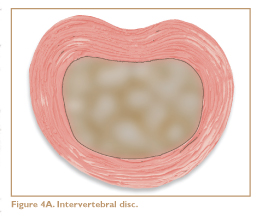 The phrase “slipped disc” is a popular misnomer. Spinal discs almost never slip, but they do crack and chip, and they may bulge and ooze out to place painful pressure on spinal nerves. Each disc is filled with a squishy substance and acts as a shock absorber, hydraulically cushioning the movement of the spinal bones. The lumbar discs are the thickest, probably because they absorb the most weight. They are roughly the diameter of a half dollar and are thicker in front than in back, conforming to the shape of the natural forward curve (Figure 4A).