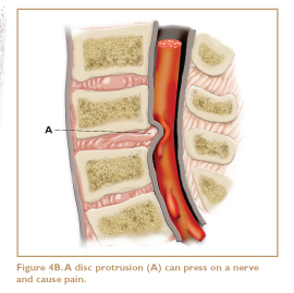 In a normal standing position, the lumbar discs are constantly pushed in an anterior direction. Therefore, if a disc is injured, it is more likely to protrude anteriorly, which causes little or no pain, than postero-laterally (to the back and side), where the nerves exit and a protrusion would cause more damage (Figure 4B).