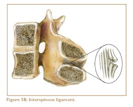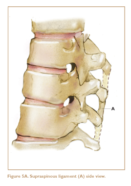 Other potential sources of aches and pains in the low back are strained ligaments. Several sets of ligaments help to hold the lower vertebrae together and keep the spine stable. The anterior longitudinal ligament and the posterior longitudinal ligament, located in front and in back of the vertebrae, respectively, embrace the discs and help to hold them in place. These are deep and are only occasionally injured. The three most commonly injured ligaments in the low back are the supraspinous, interspinous, and iliolumbar ligaments (Figures 5A, 5B, 5C).