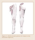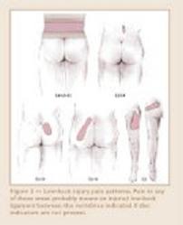 Pain in the low back may be accompanied by referred pain felt in the buttock, groin, genital, thigh, lower leg, foot, or a combination of these areas (Figures 1 and 2). Even when the low back doesn’t hurt, pain in these other locations may be caused by ligament tears in the low-back region. Pain down the leg is often called sciatica or sciatic pain. Sciatica is not a precise diagnostic term, for many things can cause this pattern of pain.