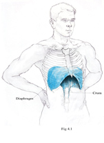 The movement of exhalation—the diminution of the rib cage—takes place when the diaphragm relaxes. The diaphragm is the only breathing muscle we engage when we are lying down. When our bodies are thus fully supported by gravity, exhalation is a passive movement of the diaphragm that should involve no sense of effort.