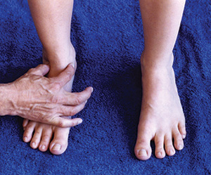 Have the client stand naturally, and take a good look at the alignment of the person’s feet. Well-aligned feet are parallel or rotated outward no more than 5 degrees. When the feet are pronated, the arches drop and may almost touch the floor; the feet are generally rotated 10–20 degrees laterally. Also, when the person bends the knees 2–3 inches, the knees will go straight forward while the feet point outward. To relieve the strain on the entire medial leg and prevent future damage from occurring, this type of misalignment is as important to address as the injury itself.