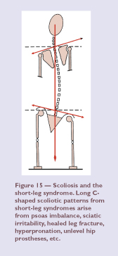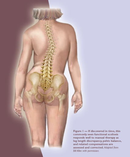 If the convexity of the curve is opposite the short-leg side, the therapist should look for non-neutral dysfunctions (facets stuck open or closed) in the lower lumbar vertebrae and lumbosacral junction. These individuals fill our practices daily, complaining of low-back and hip pain where no pathology is present. Attempting to relieve functional scoliotic pain without a good understanding of spinal and muscle biomechanics is usually futile. Functional scoliosis is extremely common and treatment options must be developed to help this ailing population. Of course, early detection and deep-tissue corrections are vital in preventing painful compensatory spinal problems that could manifest throughout adulthood.