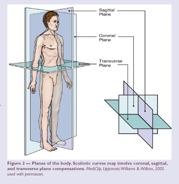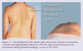 Abnormal spinal curves can occur in more than one of the body’s planes (see Figure 2, above). Names familiar to manual therapists like hyperkyphosis and hyperlordosis describe excessive sagittal plane curvatures, whereas horizontal (transverse plane) compensations are commonly referred to as rotations or torsions. Although scoliotic (side-to-side) curves are primarily considered coronal plane deviations, sagittal and coronal influences often occur in tandem. An excellent example is the frequently seen humped back (lateral and posterior) scoliokyphotic deformity (see Figure 3, above).