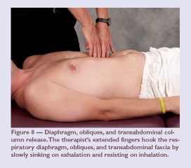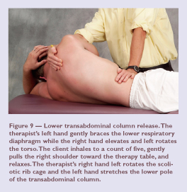 Stretch-weakened muscles, ligaments, and fascia are reciprocally overpowered as hypertonic erectors on the opposite side shorten, forcing the spine to bow. Typically, these myofascial tissues become neurologically inhibited due to joint dysfunction, trauma, overuse syndromes, faulty posture, or paralysis. In Figure 5, right, the therapist’s fingers tonify stretch-weakened erectors and serratus posterior muscles with fast-paced spindle stimulating maneuvers via the dynamic gamma motoneuron system. Extended fingers then hook and reposition the laterally migrated paravertebrals back on top of the bulging ribs. To lengthen the erector spinae muscles on the concave side, the therapist reaches across with extended fingers, digs into the left lamina groove, scoops out the wiry spinalis muscles, and stretches all the erectors laterally. Once some spinal bowing has been removed, additional rib cage flattening can be accomplished by depressing the scapula (see Figure 6, right), lengthening latissimus dorsi (see Figure 7), releasing the diaphragm and obliques (see Figure 8), and stretching the inferior end of the transabdominal fascial column (see Figure 9).