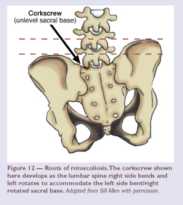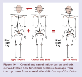 Approximately 70 percent to 90 percent of scoliosis is termed idiopathic, implying no known cause for the dysfunction. However, structurally trained manual therapists often find that many idiopathic scoliotic deformities labeled as fixed (irreversible) are actually compensations due to sacral or cranial base unleveling (see Figure 10). If sacral and cranial base unleveling indeed prove to be causal factors in a portion of presumed idiopathic cases, the no-known-cause definition should no longer apply. Information sharing among complementary medical professionals concerning possible biomechanical and biochemical origins of scoliosis provides hope that someday many more cases will lose their idiopathic classification.