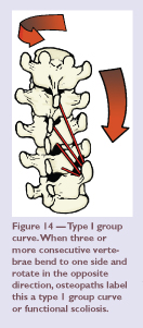 In a forward-bent position, the left side of the upper back may be more posterior than the right, while at the thoracolumbar junction, the right side is more prominent than the left. The ability to recognize the various rotational components and compensations is highly important during the functional scoliotic screening exam. Typically, the vertebrae in the curve tend to side bend in one direction and rotate oppositely. If three or more consecutive vertebrae side bend together to one side and rotate in the opposite direction, osteopaths refer to this as a type 1 group curve or a functional scoliotic pattern (see Figure 14).
