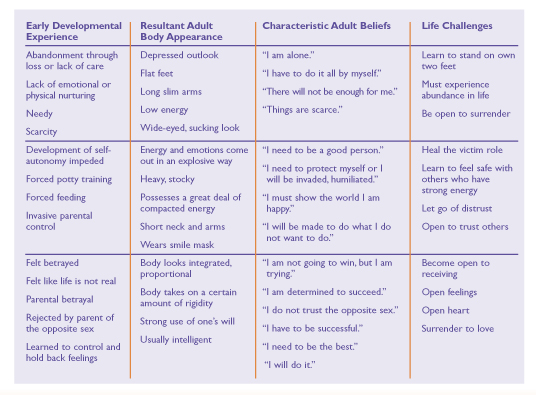 a frozen sculpture of our early emotional experiences. Psychologists know that early traumatic experiences can create maladaptive psychological symptoms in the adult personality, but that the nature of those experiences can be identified in a person’s body is not common knowledge. Body psychotherapists, such as core energetic therapists, use this principle to begin to understand our early wounding, how it affects our level of consciousness, and influences the choices we make in our lives.