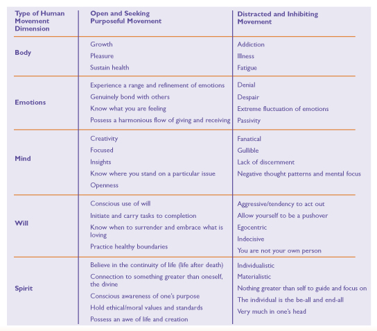 Moreover, unique to our embodied state, we experience life in five dimensions—through our body, emotions, mind, will, and spirit. These dimensions enable us to consciously love, discover, create, and serve.
